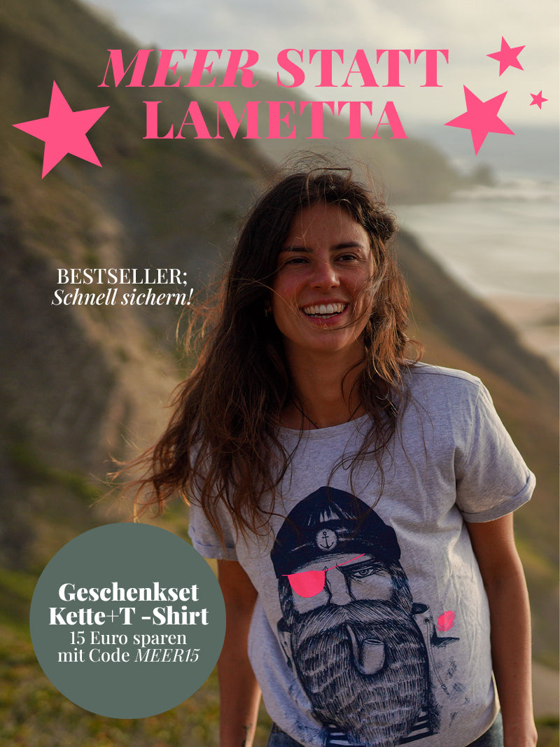 Zwei Geschenke kaufen - 15 Euro sparen! Das ist die Idee hinter der Kombination T-Shirt Seemann für Frauen & schwere Muschelkette.